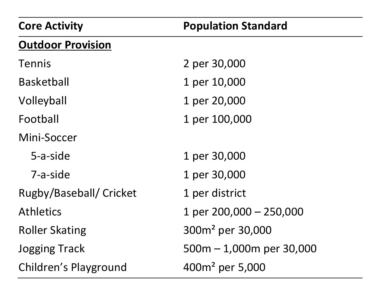 Table 1. Extract from the ‘Standards of Provision for Core Activities’, Hong Kong Planning Standards and Guidelines.